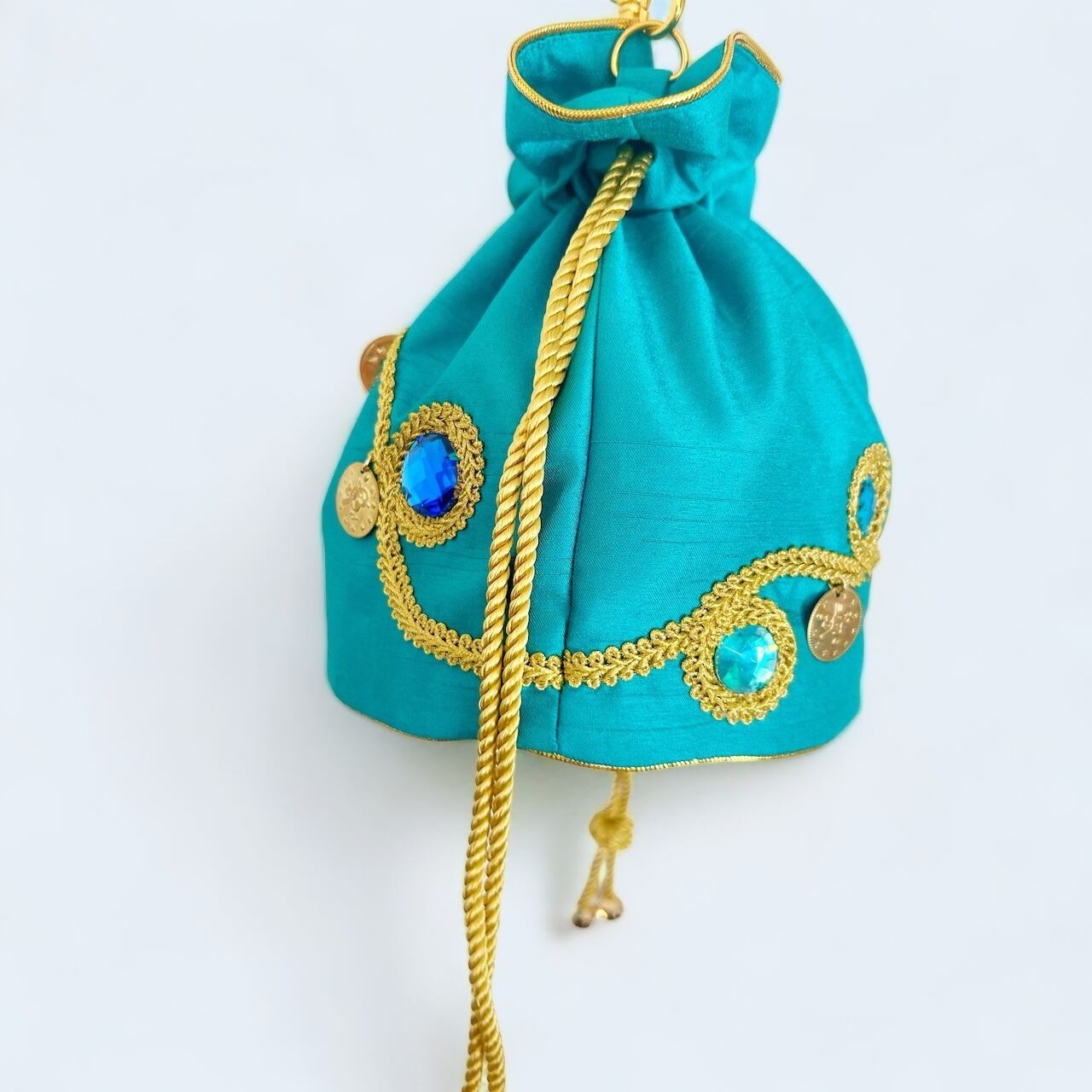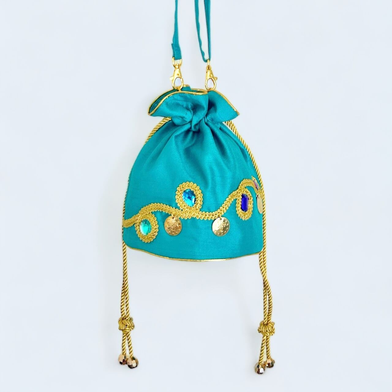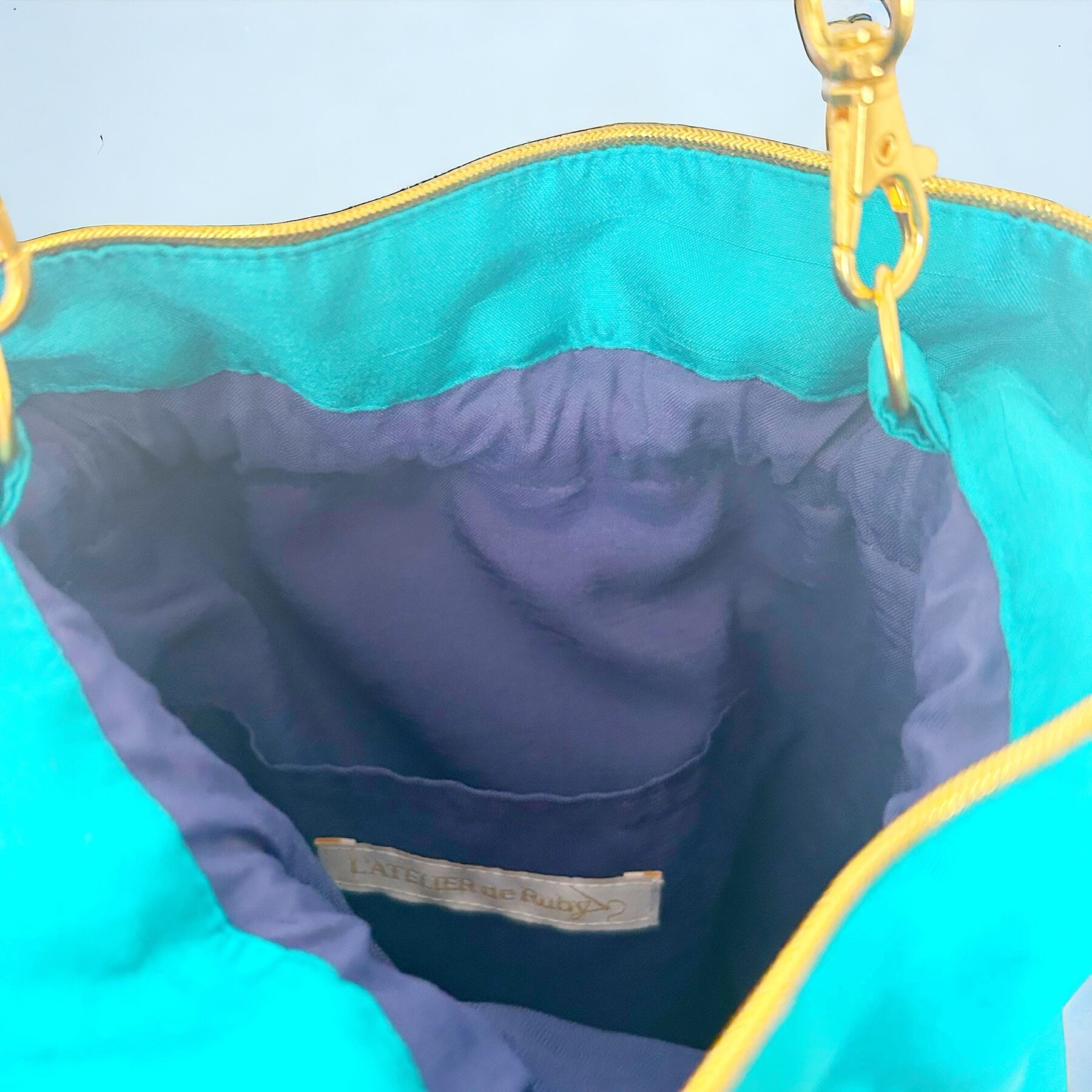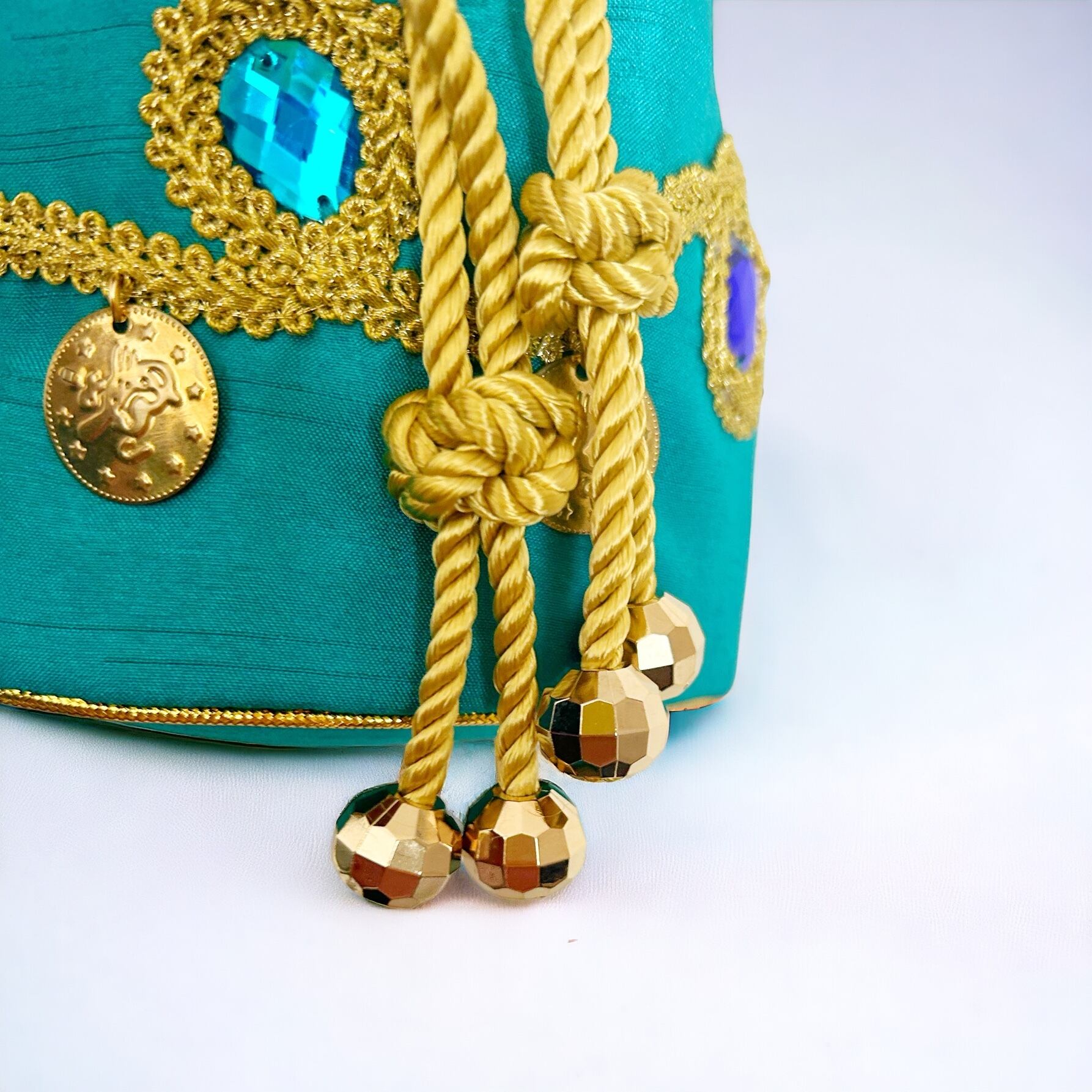 鮮やかなピーコックグリーンとグリーン、ブルー系のビジューは美しい異国の海のよう。
